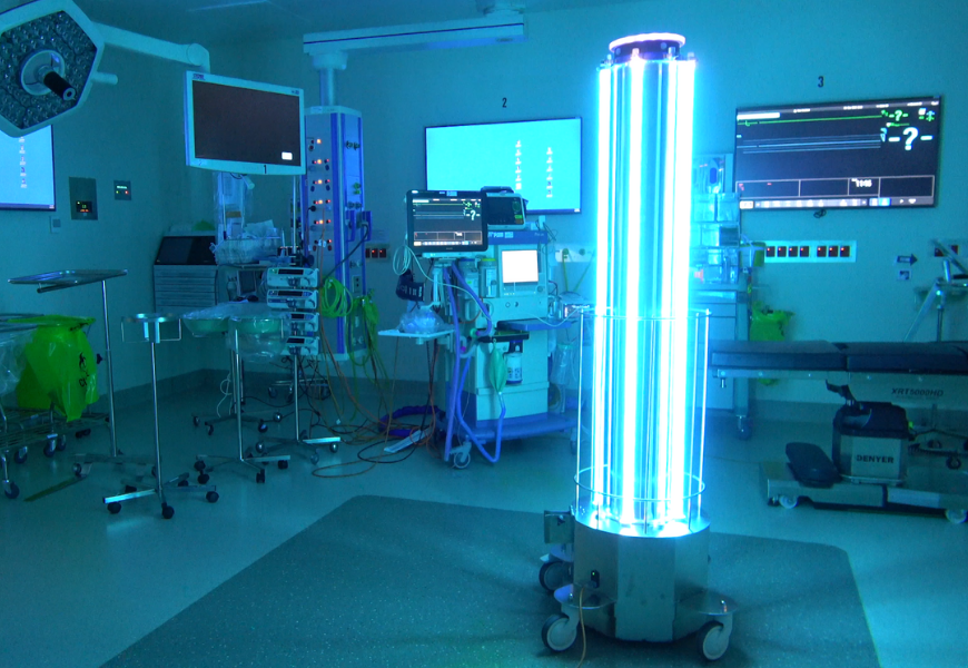 “You park it in a hospital room, fire up the UVC emitters and it bathes the room in high output ultraviolet radiation, which disinfects the room,” says Josh.