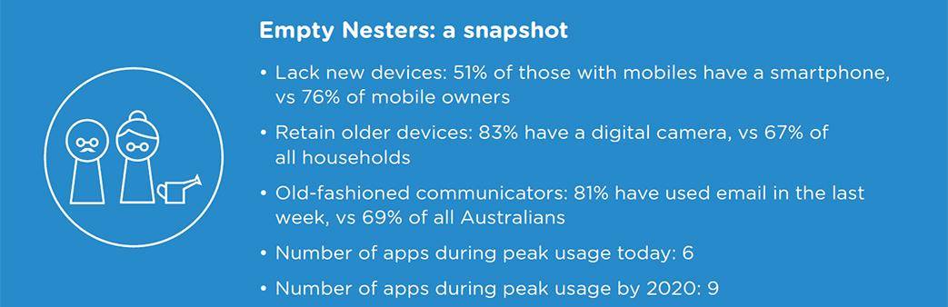The range of technologies they use is narrower than other households, however their use of the technology they do have is high. In 2020, Empty Nester Households could have an average of nine applications running simultaneously, up from six in 2015.