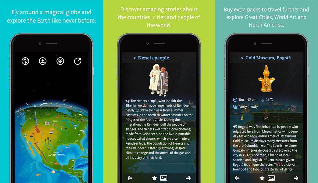 With each destination that they visit, children are able to view drawings and animations representing the people, animals and buildings of the area.