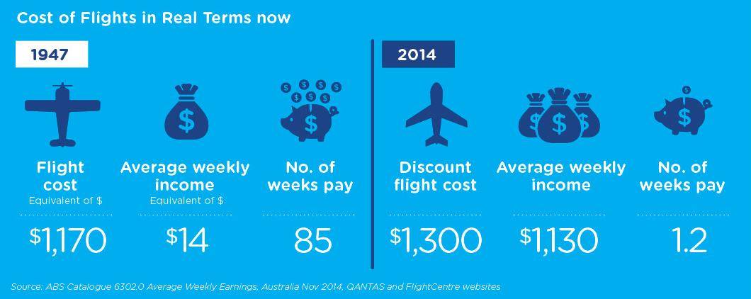 Why has the number of Aussies travelling every year increased from two million to eight million in a generation? Check out below how much a flight used to cost in comparison to the average weekly income...