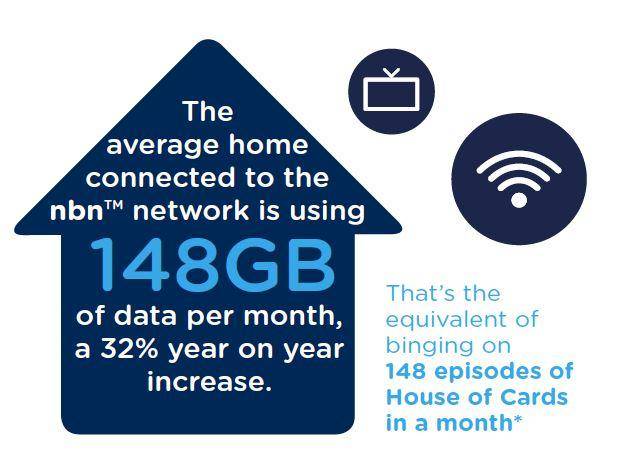 When Netflix launched in March 2015, the average end user connected to services over the nbn™ network was consuming only 70GB/month – this month we expect that average consumption to top 148GB/month and it just keeps growing.