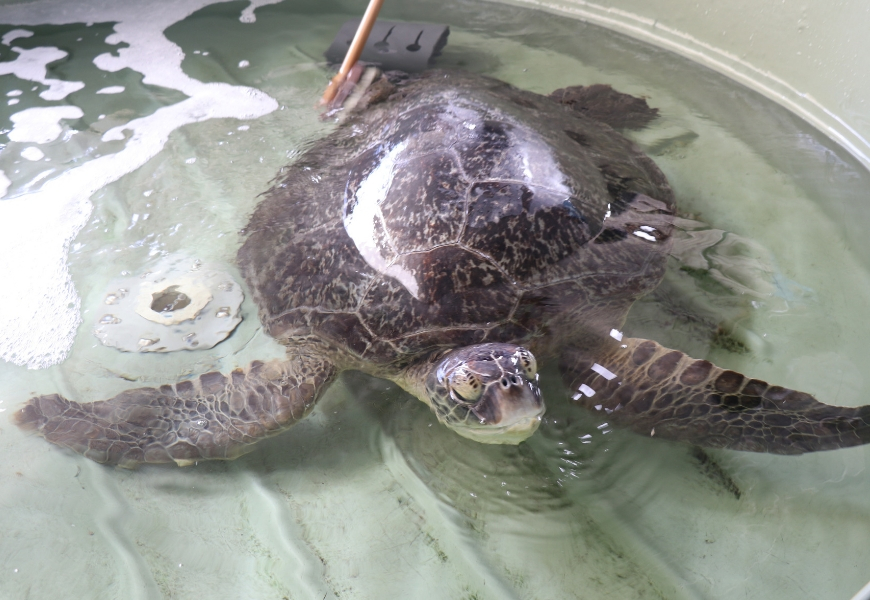 "Now this is typically what they’ll do for themselves. Out in the wild, it’s not unusual to find turtles under ledges, and they’ll keep their carapace – or shell – fairly clean of any fouling marine life. They’ll actually visit what we refer to as ‘cleaning stations’, where different fish species may use their shell as a big dinner plate and graze off any algae or other marine life that has settled upon it. I don’t think she would get tired of me doing this today.”