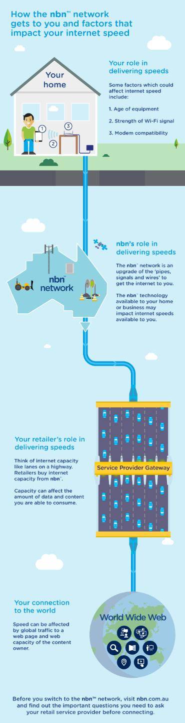 While there are multiple network steps in the online connectivity chain, nbn only has control over wholesale speeds on the nbn™ network for providing access to internet to Australian homes. nbn does not control how much capacity RSPs choose to purchase on the network.