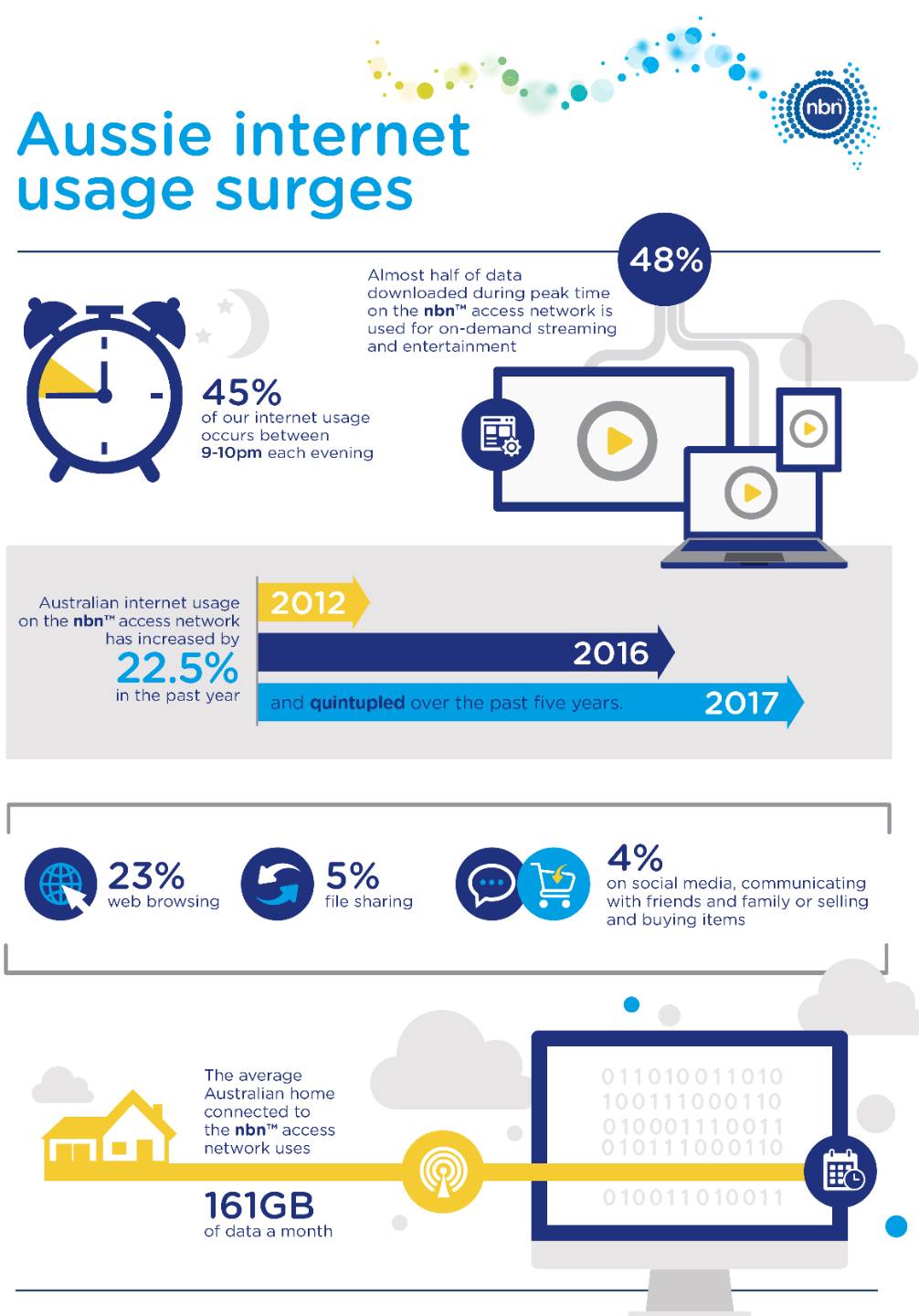 • Almost half (48 per cent) of download data used during peak traffic time (6-11pm) on the nbn™ access network is driven by people using on-demand entertainment services such as Netflix and Stan.