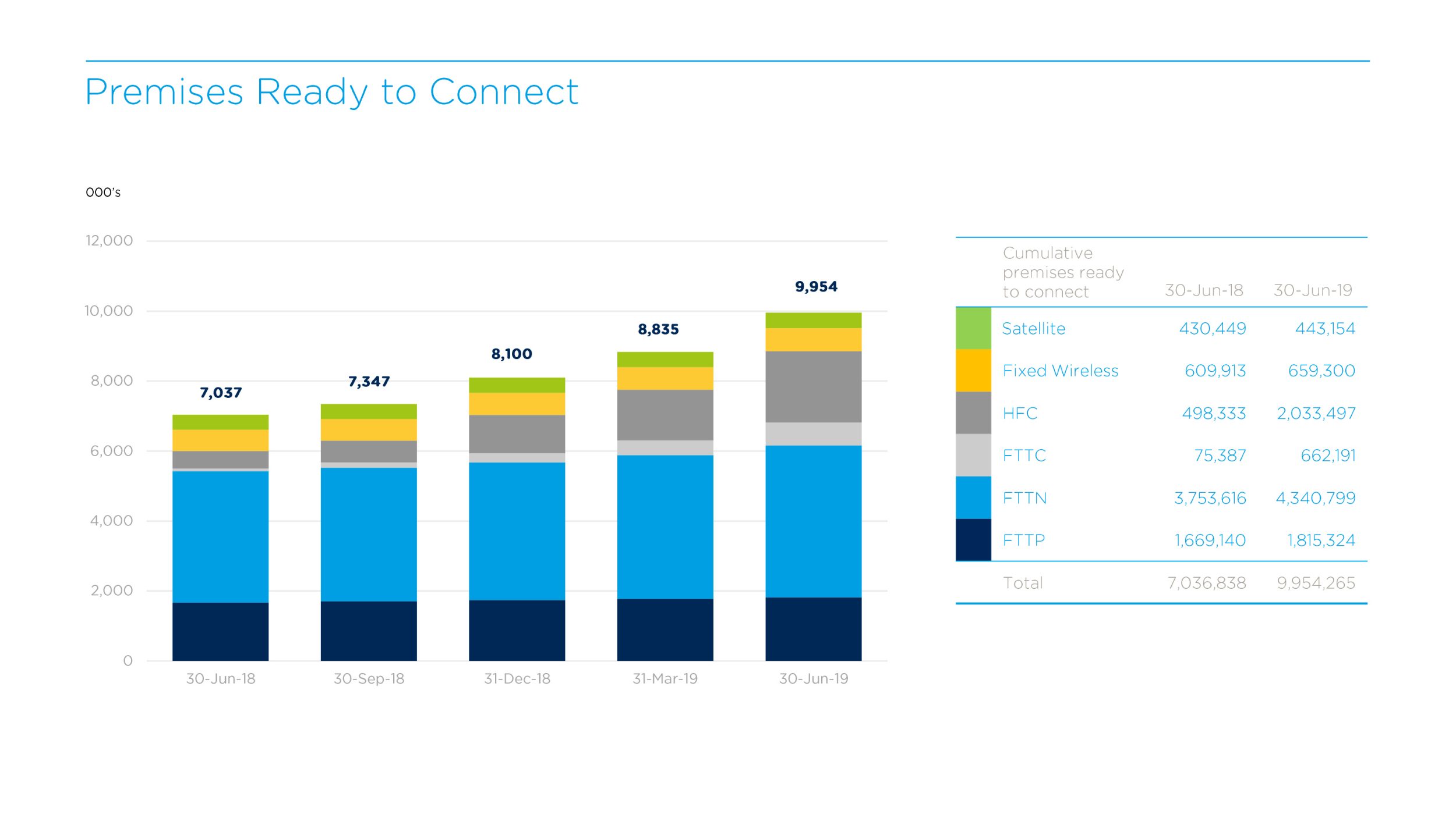 Importantly, our rollout continues to expand at pace. In FY19, we added close to three million homes and businesses to the nbn™ footprint, taking the total of premises ready to connect at the end of the financial year to 9.95 million.