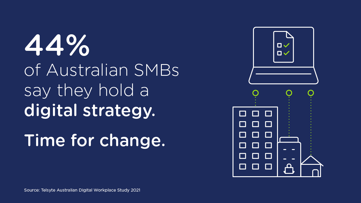 Time-strapped small businesses adapted quickly during the pandemic. However, they were often forced to bolt on new tech solutions to solve immediate problems, such as implementing digital payment systems to switch to online sales in short timeframes. This was often done without a long-term vision for those investments. According to nbn-commissioned research from analyst firm Telsyte, fewer than half (44%) of all small to medium businesses (SMBs) had a digital strategy at the end of 2020.