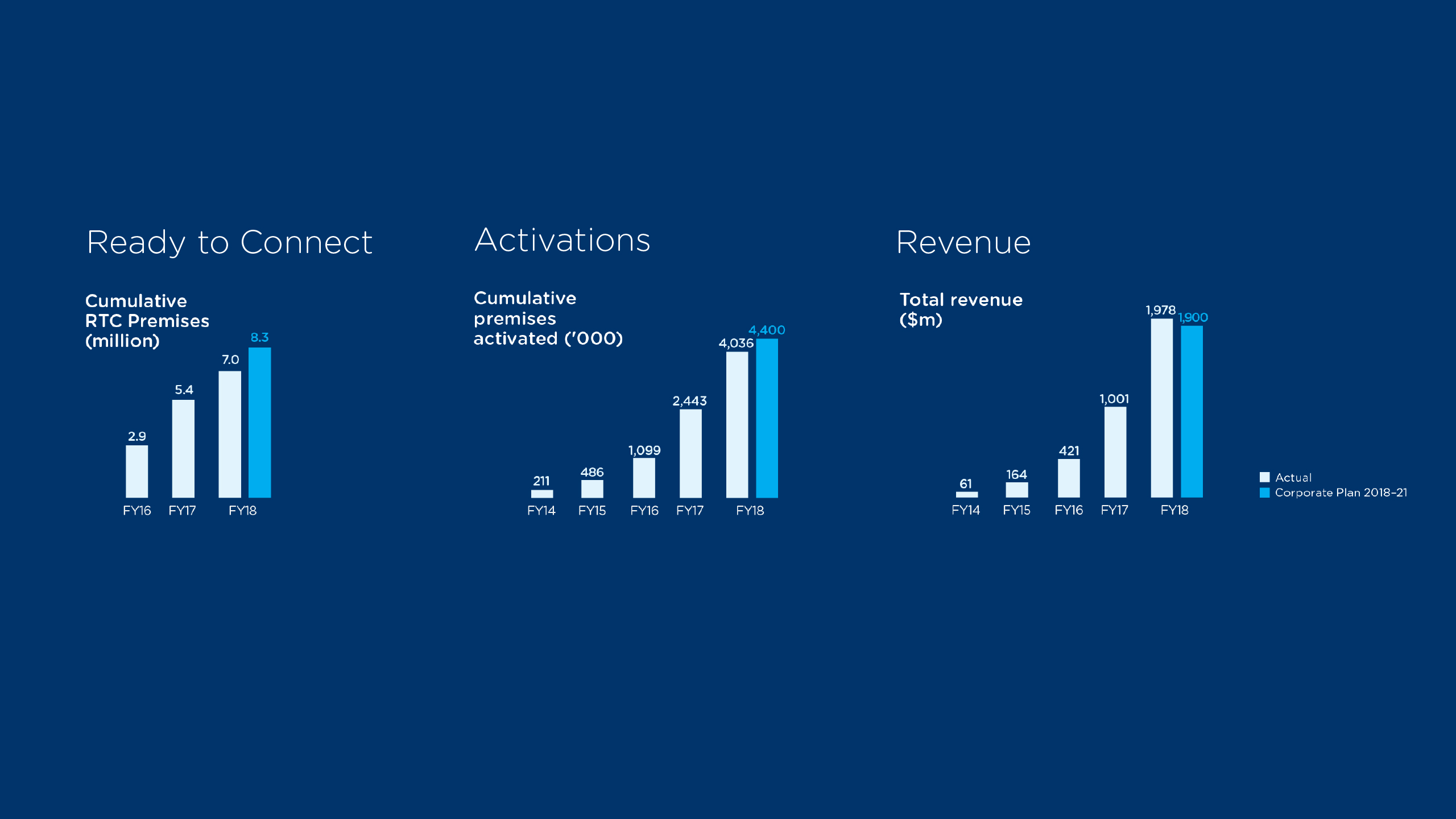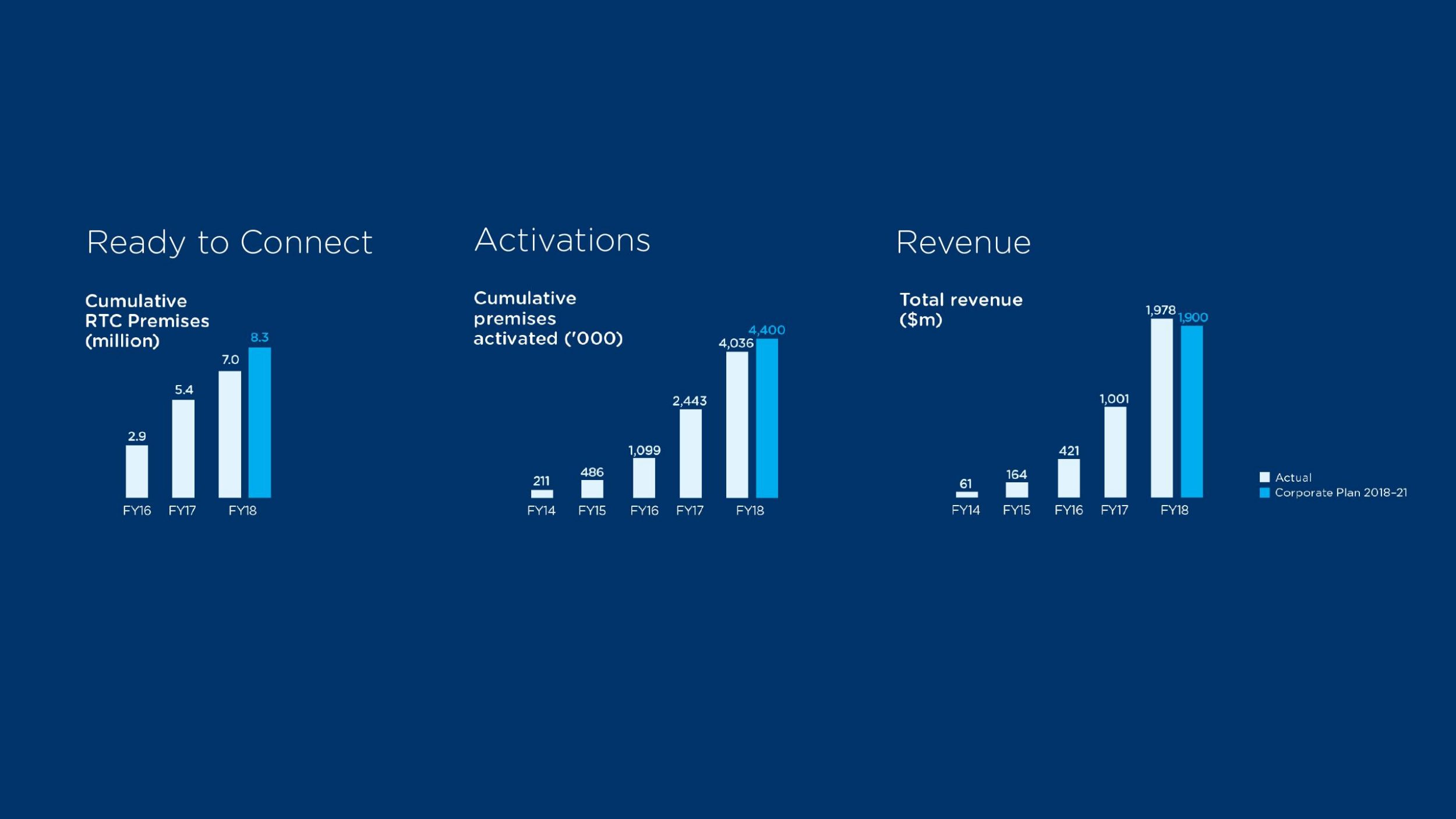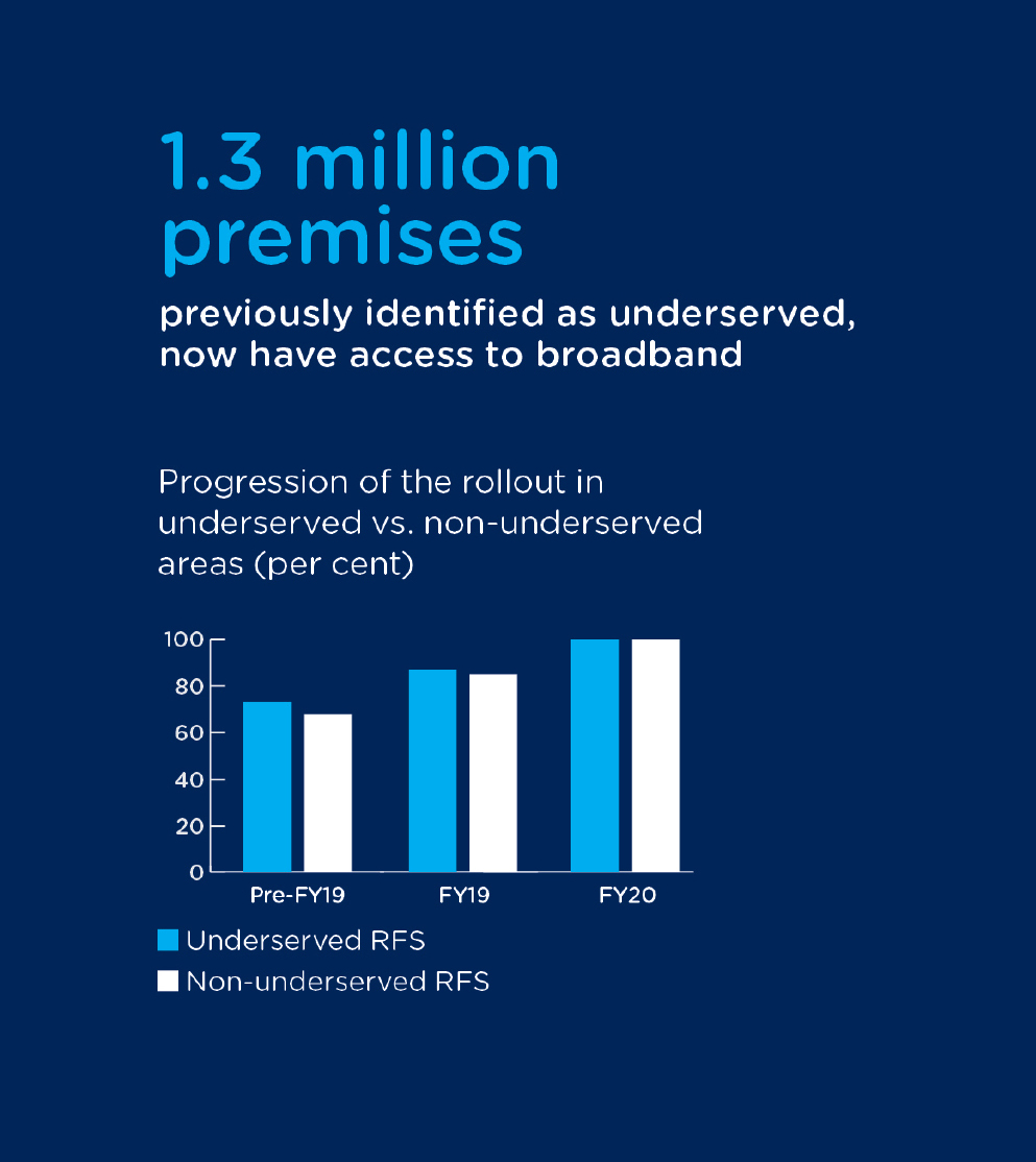 By end of FY18, the build expanded to 7.0 million premises Ready to Connect (RTC) and activated 4.0 million homes and businesses. This included priority rural and regional areas classified as ‘underserved’, where 1.3 million premises are now able to use the nbn™ access network bringing them greater digital connectivity and as a result, flexibility in how they live and work.