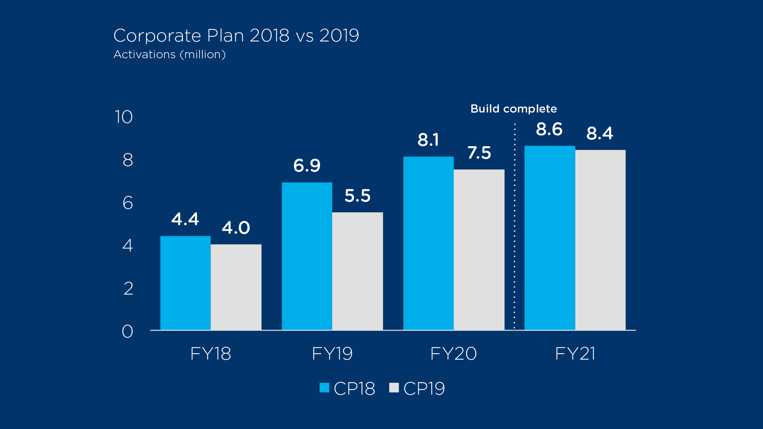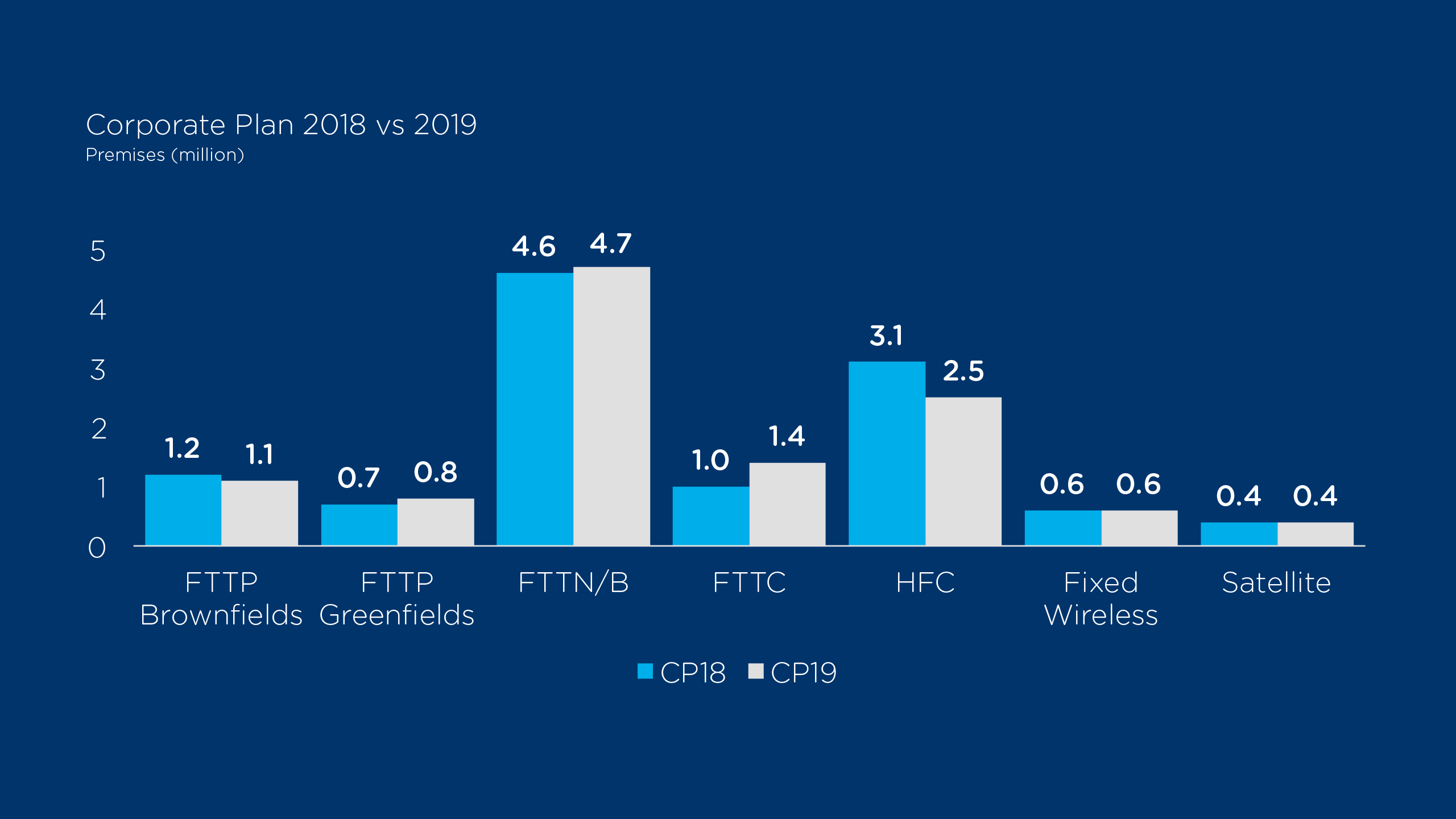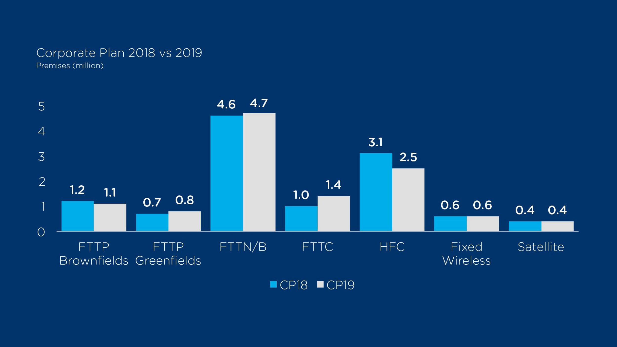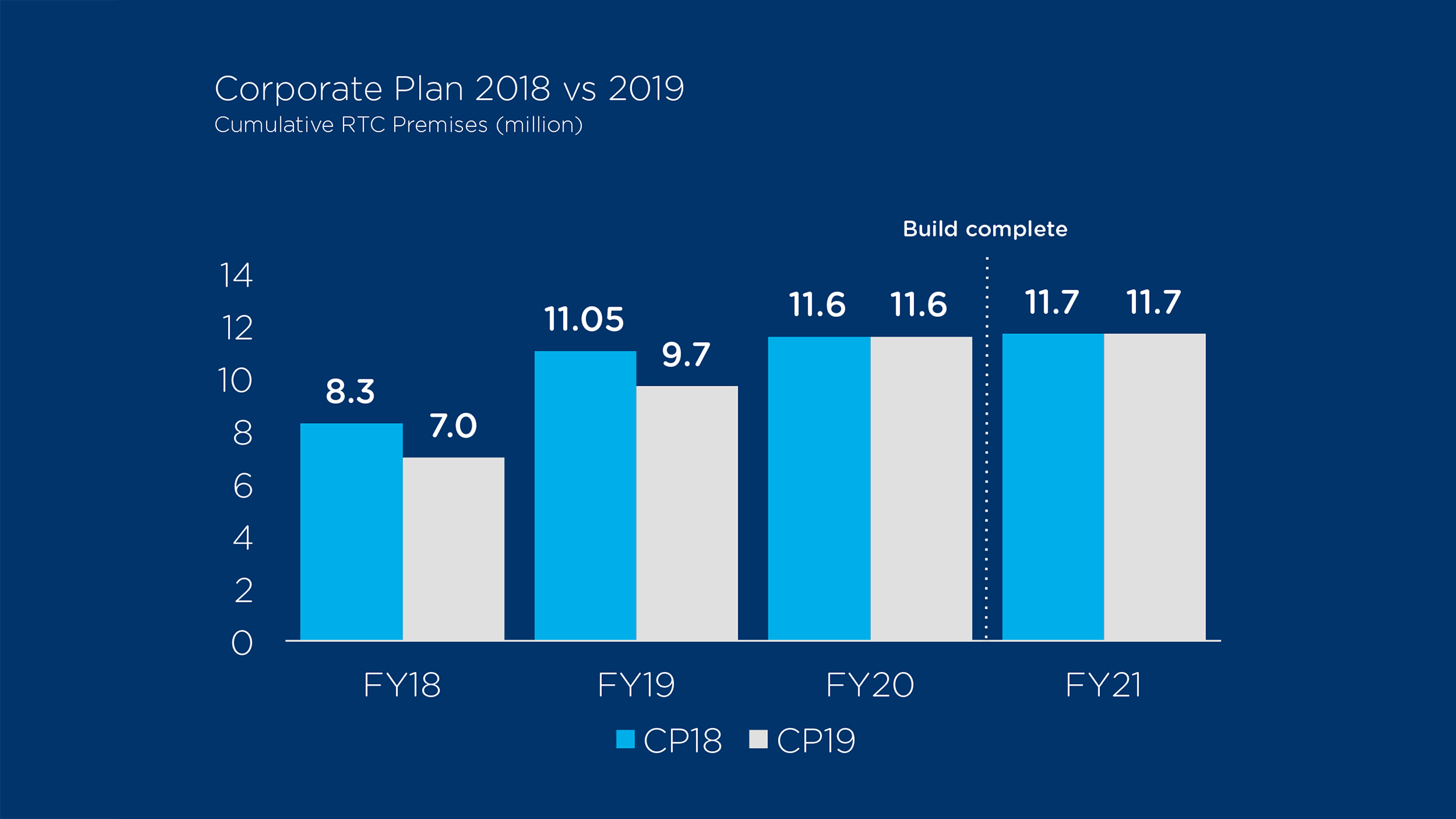 At the end of FY19, we expect an additional 2.7 million premises declared Ready to Connect and an additional 1.9 million premises for the final year of construction to complete the build by 2020.