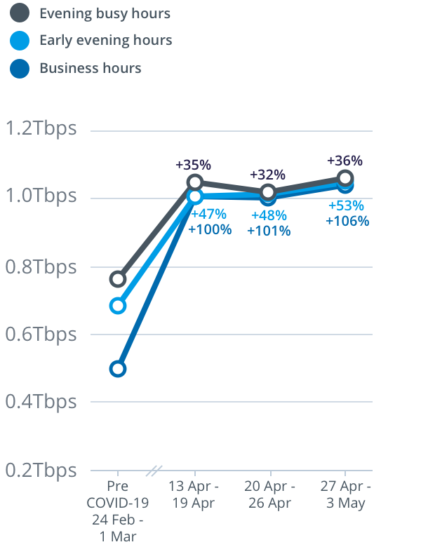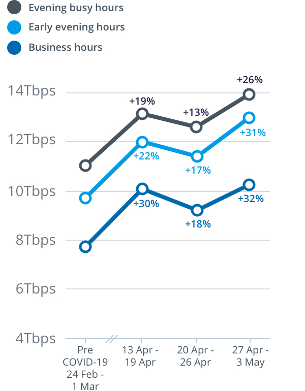 For the week from Monday, 27 April to Sunday, 3 May, peak download throughput (the measure of data flowing through the nbn™ access network) during the busy evening period increased by 26 per cent to 13.9 terabits per second (Tbps) on the main nbn wholesale service, compared to the last week of February (which nbn measures as its normal pre-COVID-19 baseline).