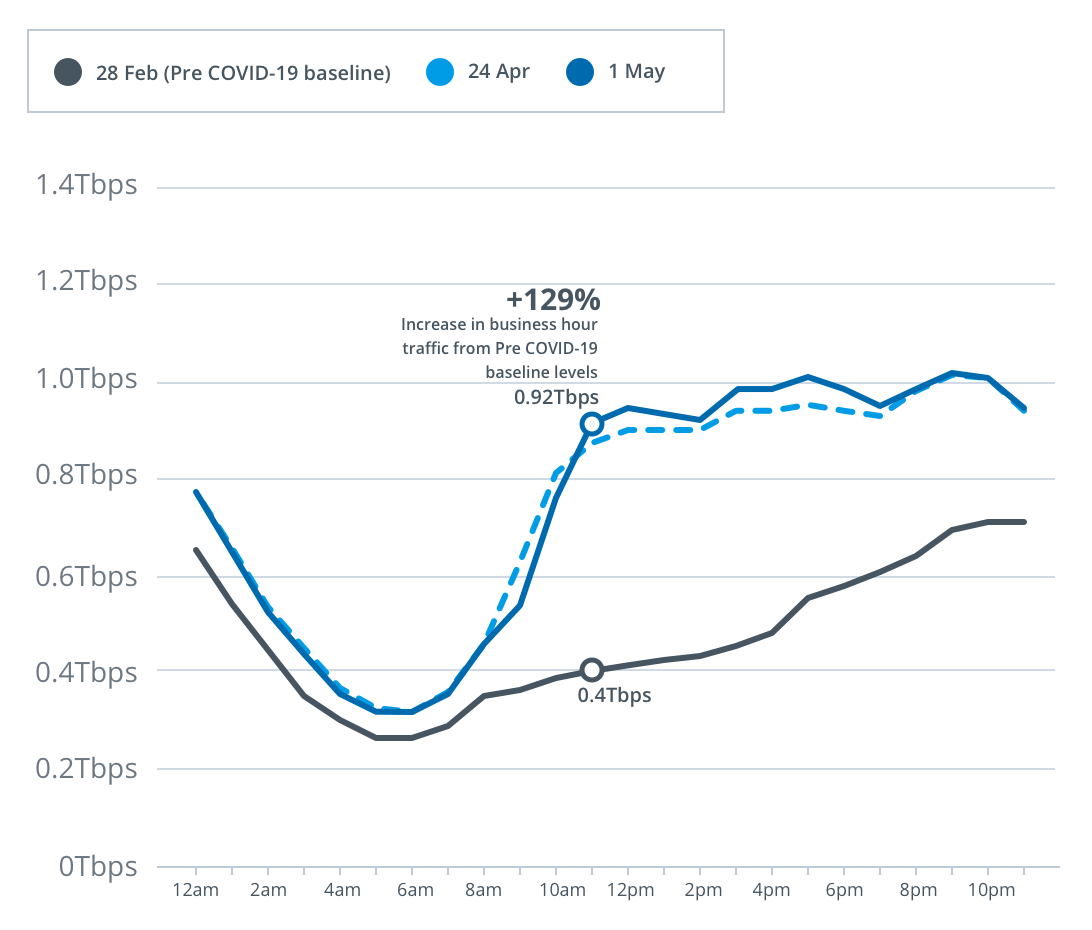 Compared to the pre-COVID-19 baseline, peak upload throughput on the main nbn wholesale service in the evening busy hours for the week beginning 27 April increased by 36 per cent to 1.05Tbps; peak upload throughput in the early evening hours increased 53 per cent to 1.04Tbps; and peak throughput during daytime business hours increased by 106 per cent to 1.03Tbps.
