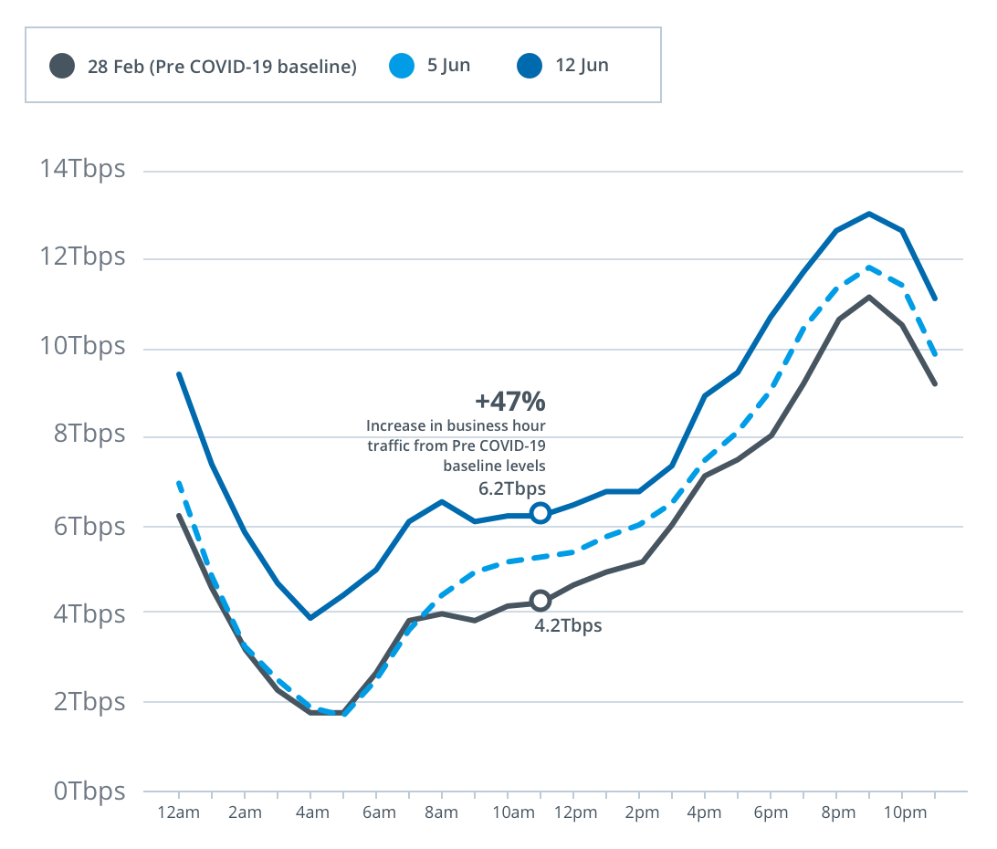 Compared to the pre-COVID-19 baseline before social distancing measures were implemented, downstream network usage on the nbn™ main wholesale service during business hours on 12 June 2020 was 47 per cent higher (as shown in the graph below at 11am) than the pre-COVID-19 baseline.