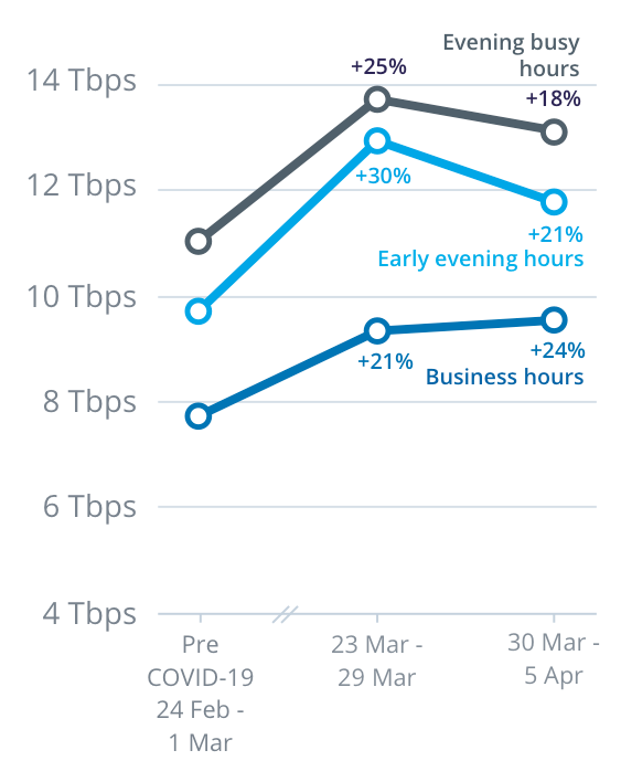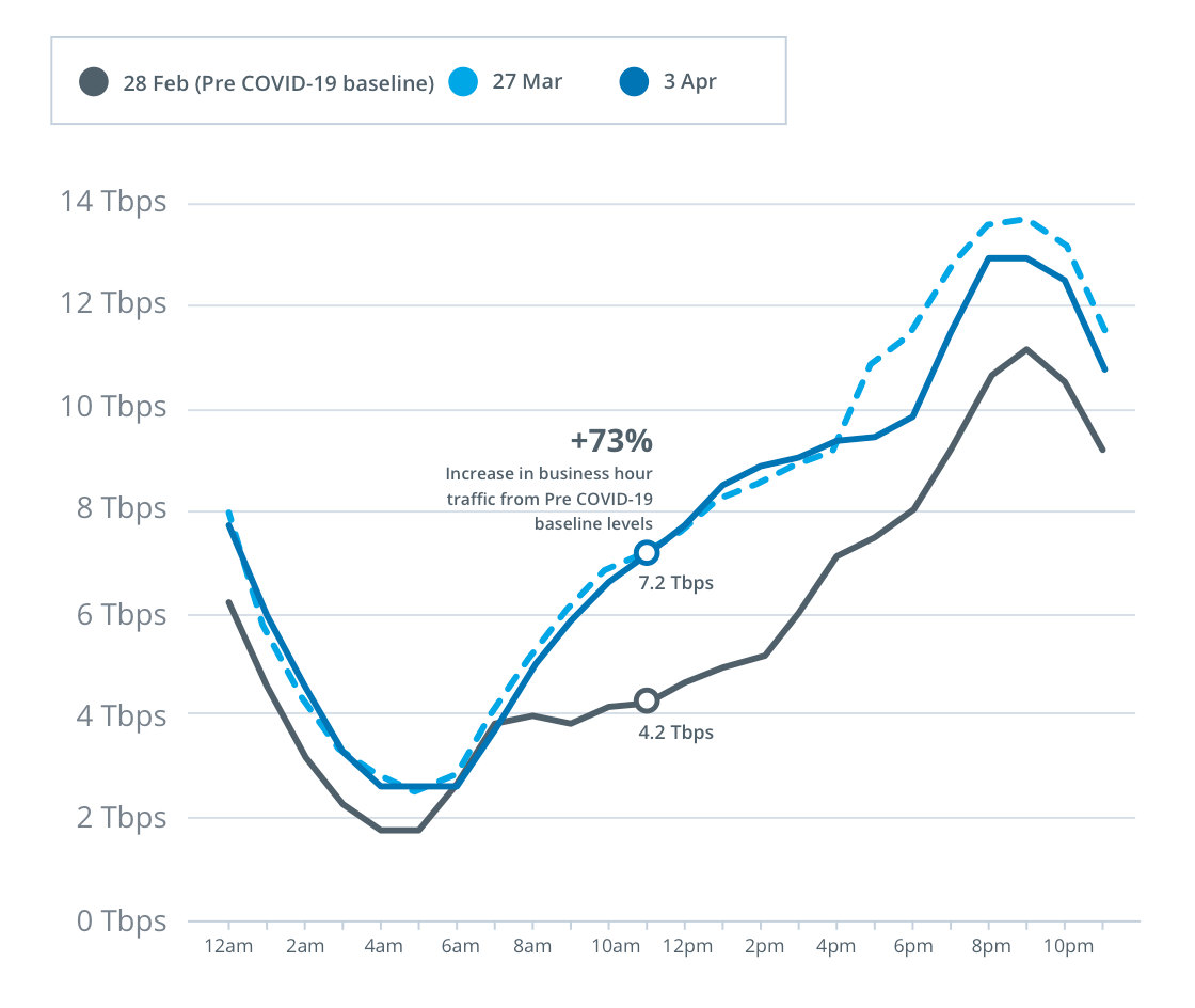Even though data demand during the early evening and busy evening hours continues to be significantly higher than the pre-COVID-19 baseline, it is only peak throughput during the daytime business hours that has grown since last week. Peak throughput recorded during business hours increased 6 per cent from the 9Tbps throughput peak that was recorded in the same time period for the week beginning 23 March.