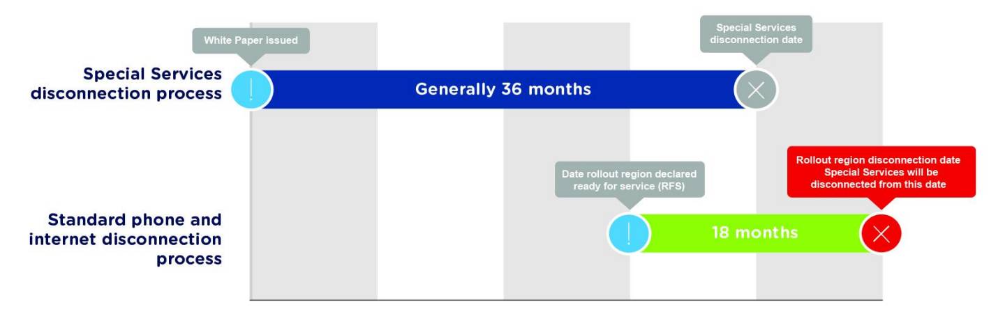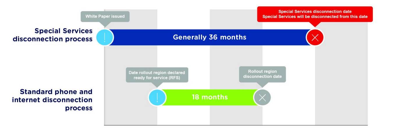 • ‘Special Services’ are a set of telecommunication products delivered on copper-based technology, primarily targeted at the business market. Previously these services didn’t have a disconnection date, but a White Paper process has now established ‘Special Services’ disconnection dates to migrate these services over to the nbn™ access network.