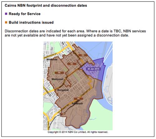 For Cairns residents living or working in the area bordered by Wharf, Florence and Bunda Streets around the Bruce Highway (see below map) the 18 month countdown to disconnection started on 20 July 2013. Other areas in the region will have different disconnection dates, depending on when the National Broadband Network (NBN) becomes available in the area.