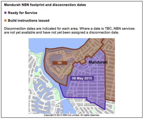 For Mandurah residents living or working in the area bordered by Mandurah Terrace and Pinjarra and Anstruther Roads (see below map) the 18 month countdown to disconnection started on 6 November 2013. Other areas in the region will have different disconnection dates, depending on when the NBN becomes available in the area.
