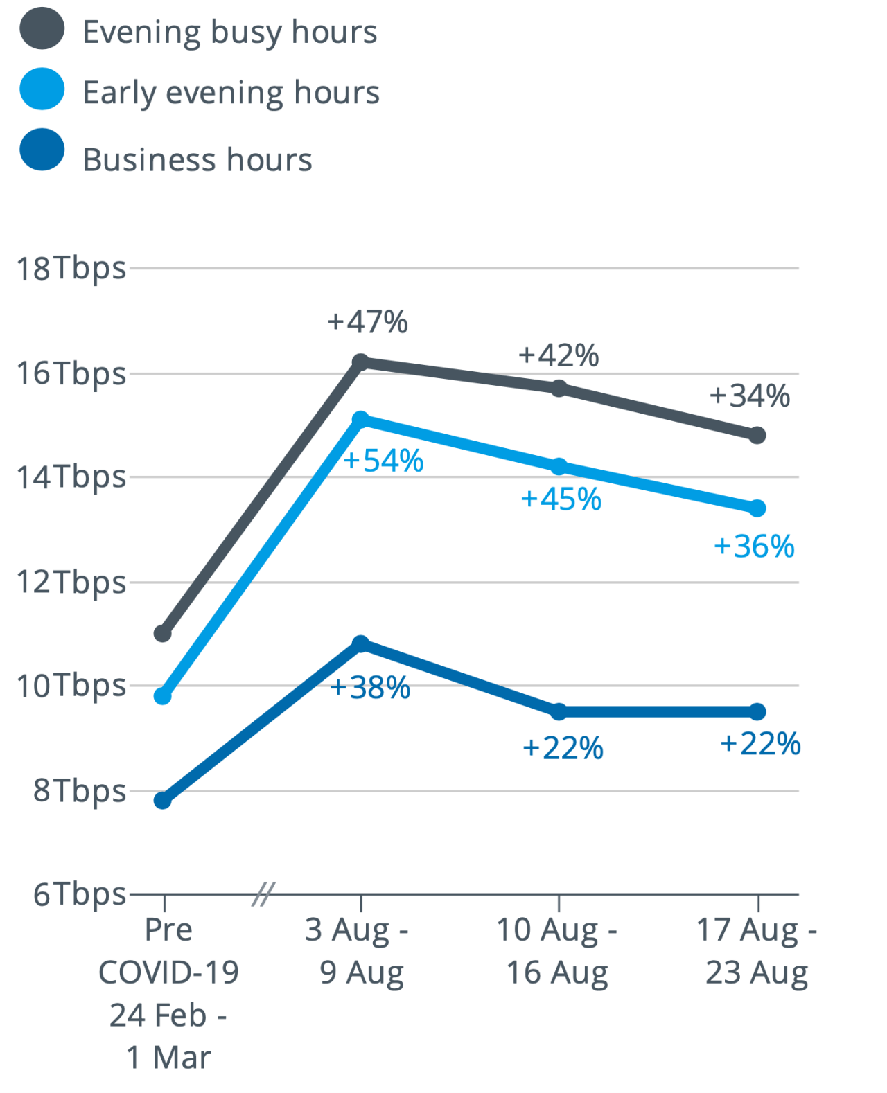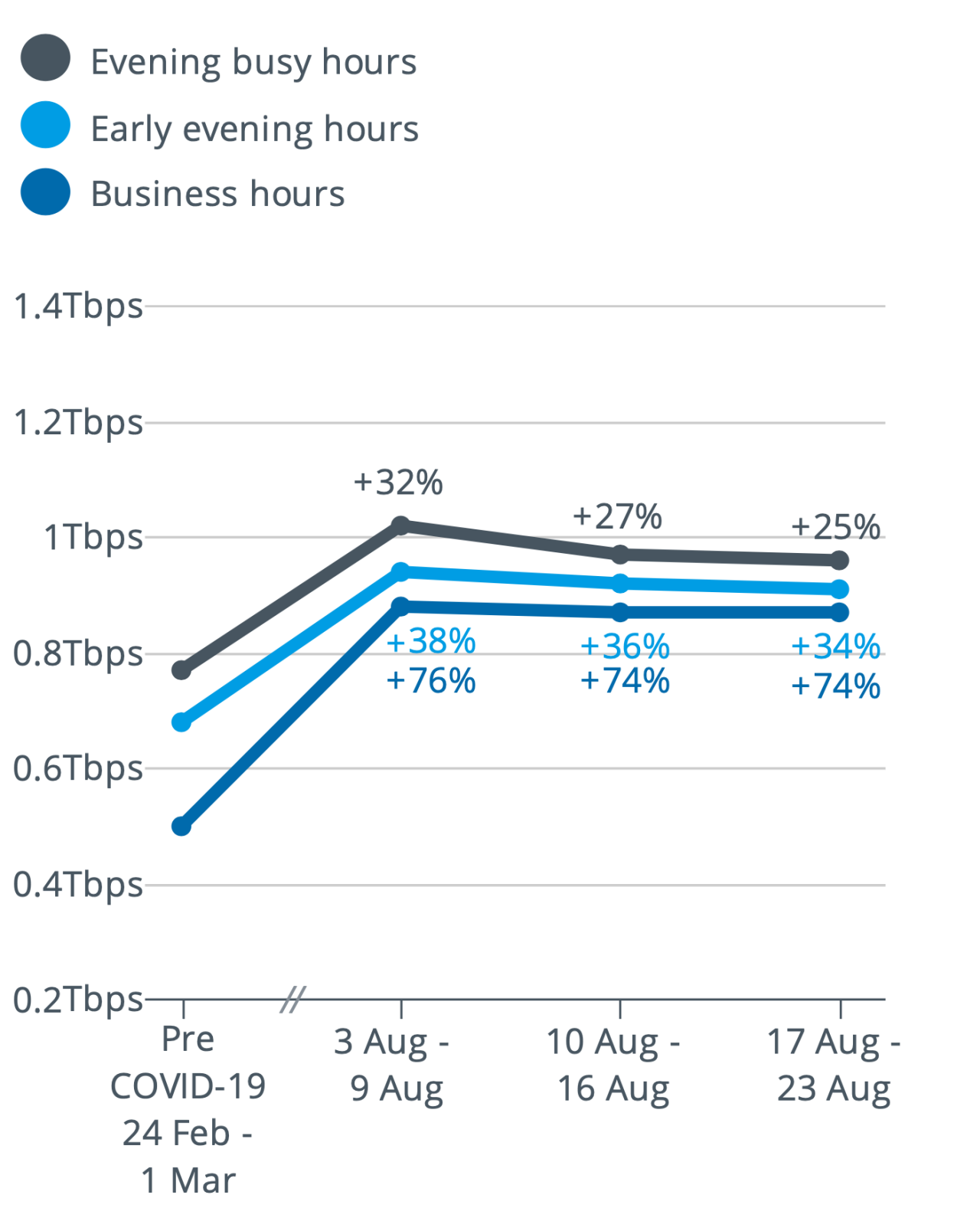 • Weekly download throughput peak of 14.8 Terabits per second (Tbps) recorded on Saturday, 22 August during the evening busy hours