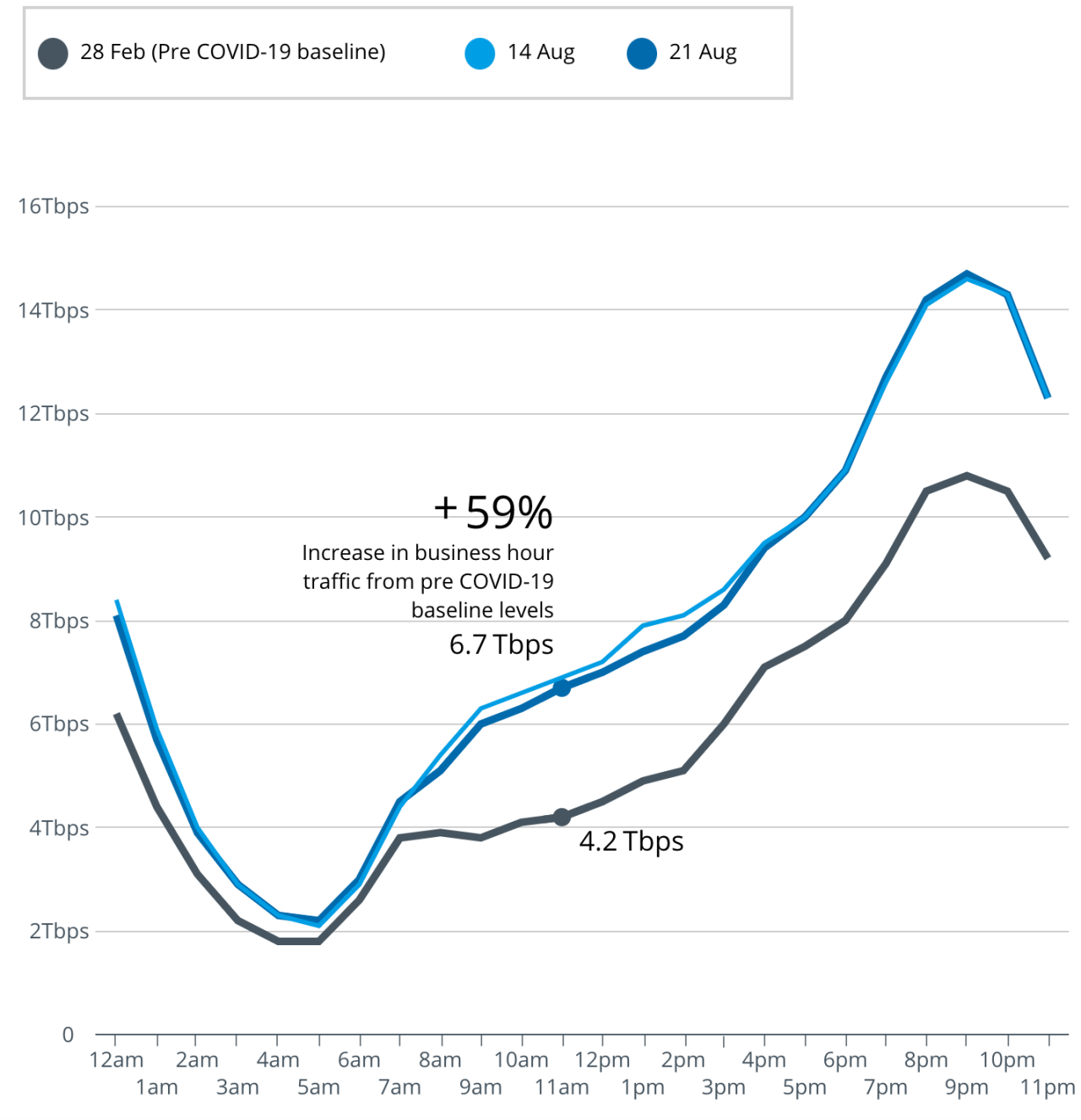 Compared to the pre-COVID-19 baseline before social distancing measures were implemented, downstream network usage on the nbn™ main wholesale service during business hours on 21 August 2020 was 59 per cent higher (as shown in the graph below at 11am) than pre-COVID-19.