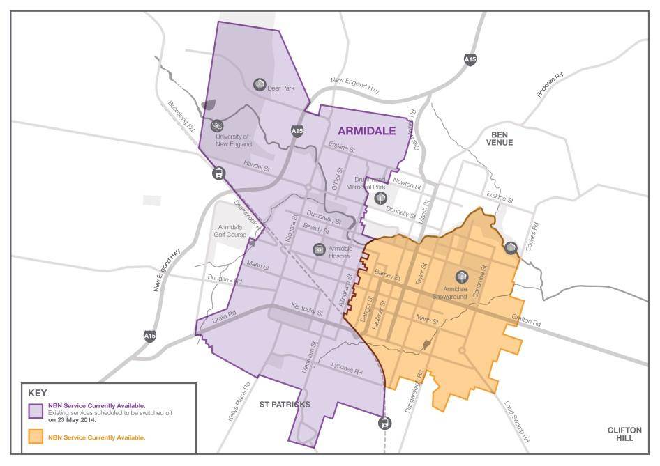 The NBN is scheduled to replace 4,680 existing home and business landline phones, ADSL internet and Telstra cable internet services in parts of Armidale, which will be officially switched off from 23 May 2014. Residents and businesses within this area need to move their existing landline phone and internet services to the NBN ahead of the scheduled disconnection date.*