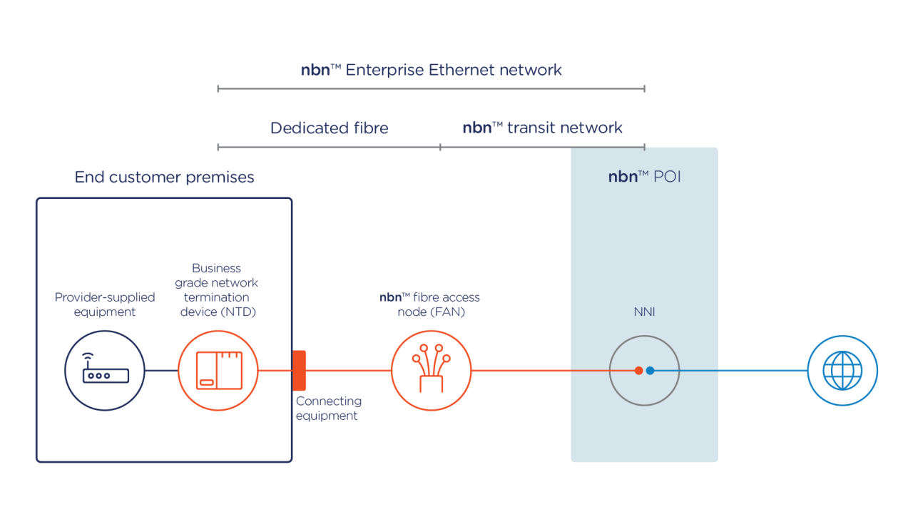 nbn™ Enterprise Ethernet connections are designed to be built on request and includes a point-to-point fibre connection. It will be packaged with a premium service-level agreement between NBN Co and retail providers to offer faster resolution of faults and to encourage retailers to offer an increased service experience for mission-critical applications.