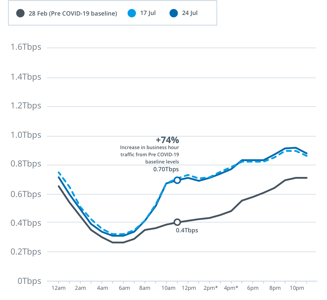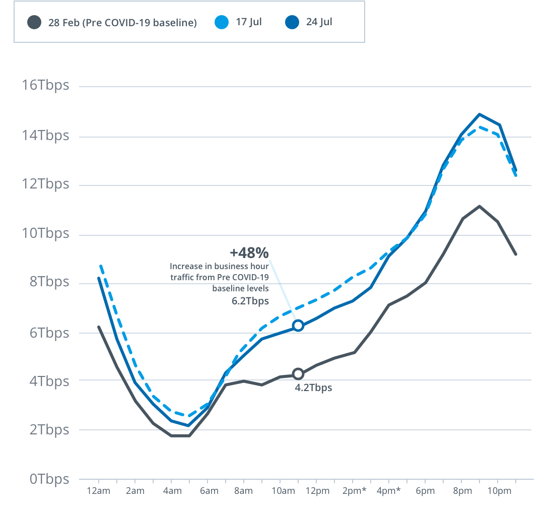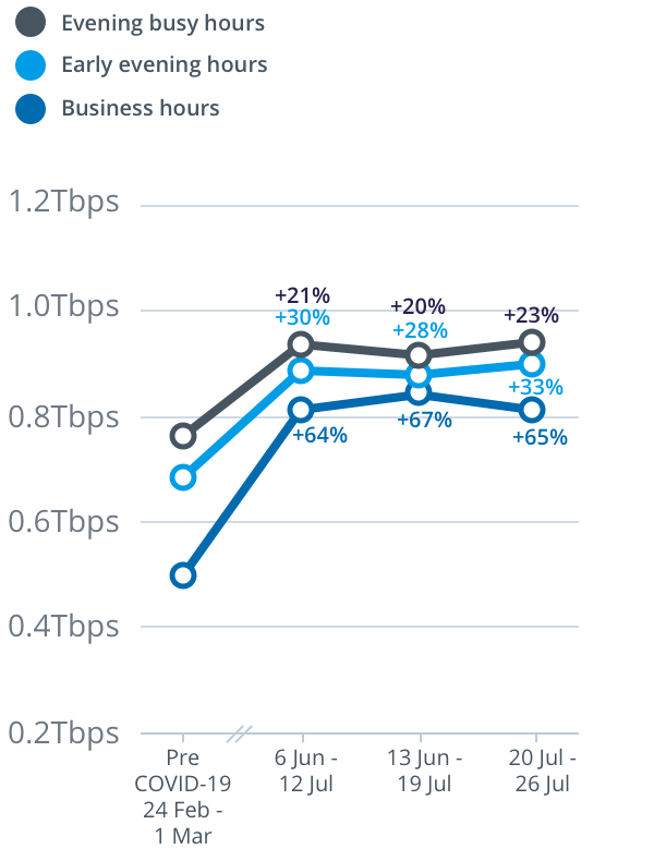 Peak download throughput during the same week also increased during daytime business hours, up 18 per cent to 9.2Tbps, and early evening hours up 39 per cent to 13.6Tbps, compared to the pre-COVID-19 baseline.