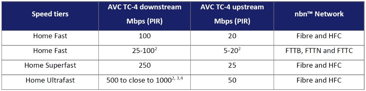 nbn is making 3 new AVC Higher Speed Tiers orderable by RSPs from 29 May 2020 as listed in the following table: