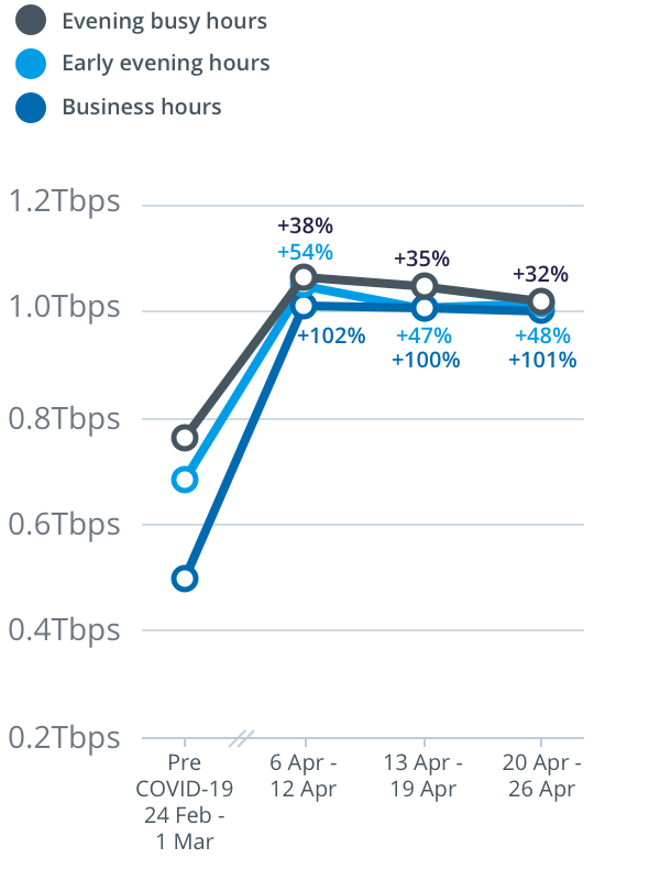 - Weekly upload throughput peak of 1.02Tbps recorded on Friday, 24 April during the Evening Busy Hours