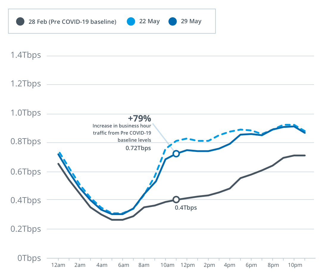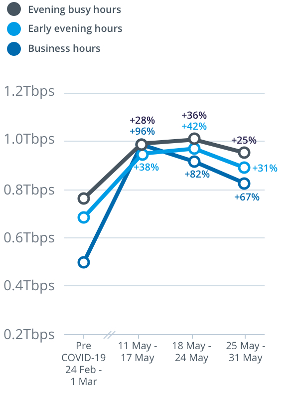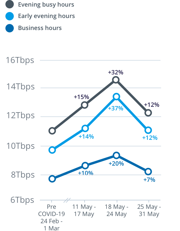 For the week from Monday, 25 May to Sunday, 31 May, peak download throughput (the measure of data flowing through the nbn™ network) during the busy evening period increased by 12 per cent to 12.3 terabits per second (Tbps) on the main nbn wholesale service, compared to the last week of February (which nbn measures as its normal pre-COVID-19 baseline). This is down from a peak of 14.5Tbps from the previous week.