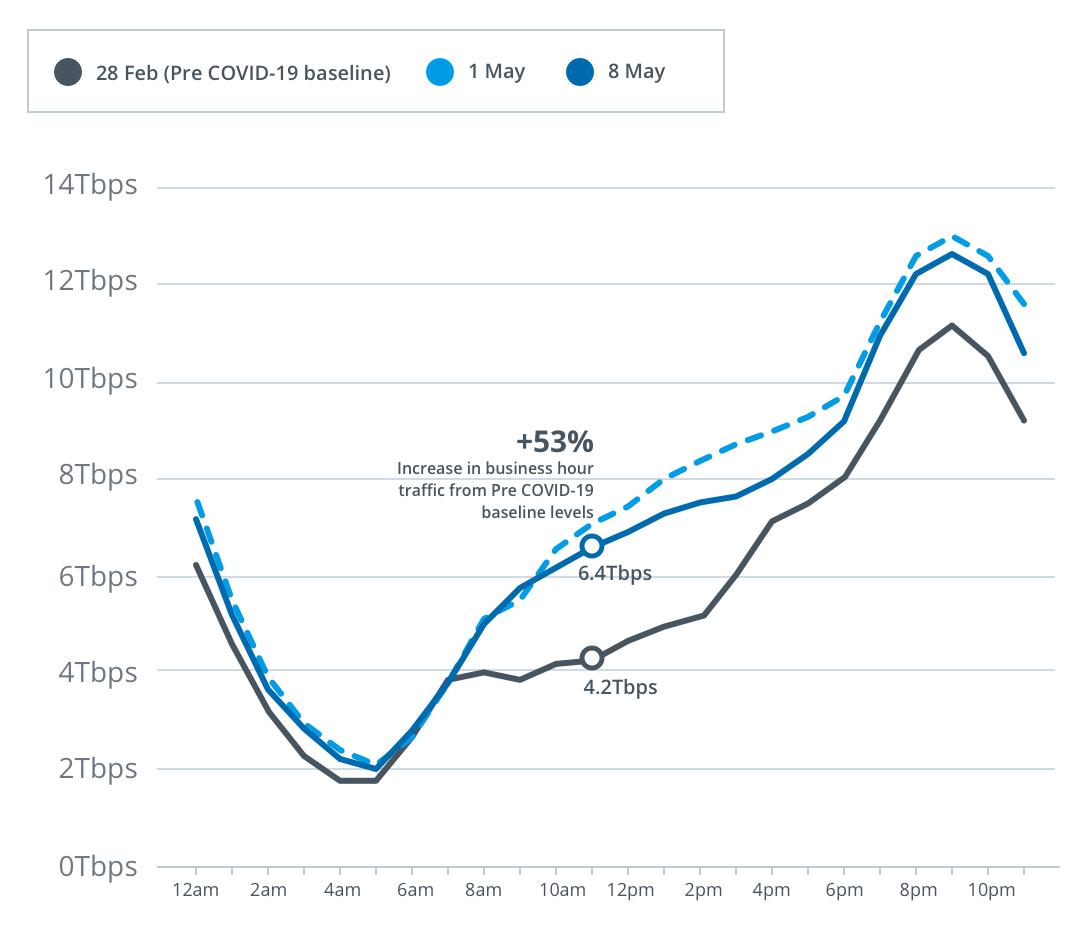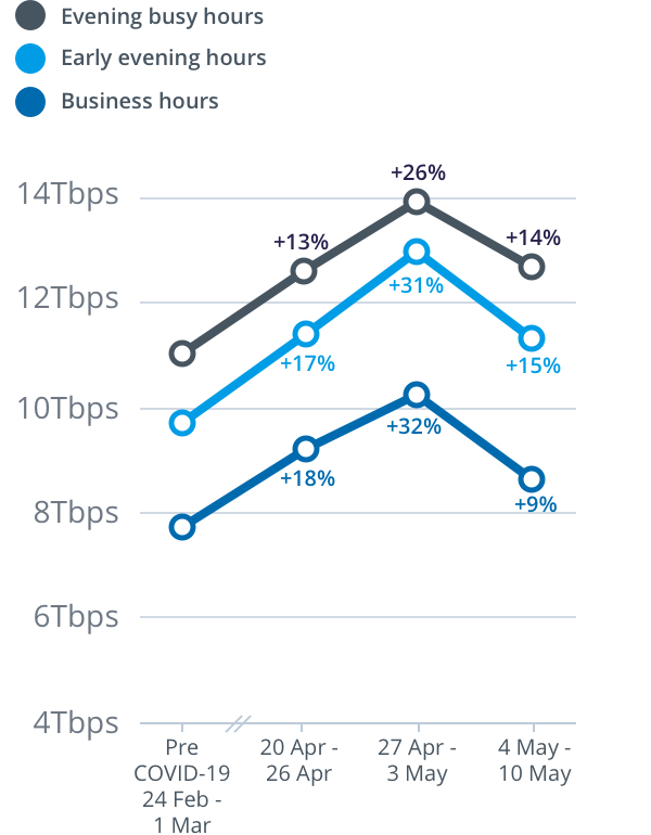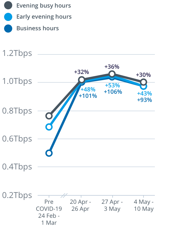 Compared to the pre-COVID-19 baseline, peak upload throughput on the main nbn wholesale service in the evening busy hours for the week beginning 4 May increased by 30 per cent to 1.00Tbps; peak upload throughput in the early evening hours increased 43 per cent to 0.97Tbps; and peak throughput during daytime business hours increased by 93 per cent to 0.97Tbps.