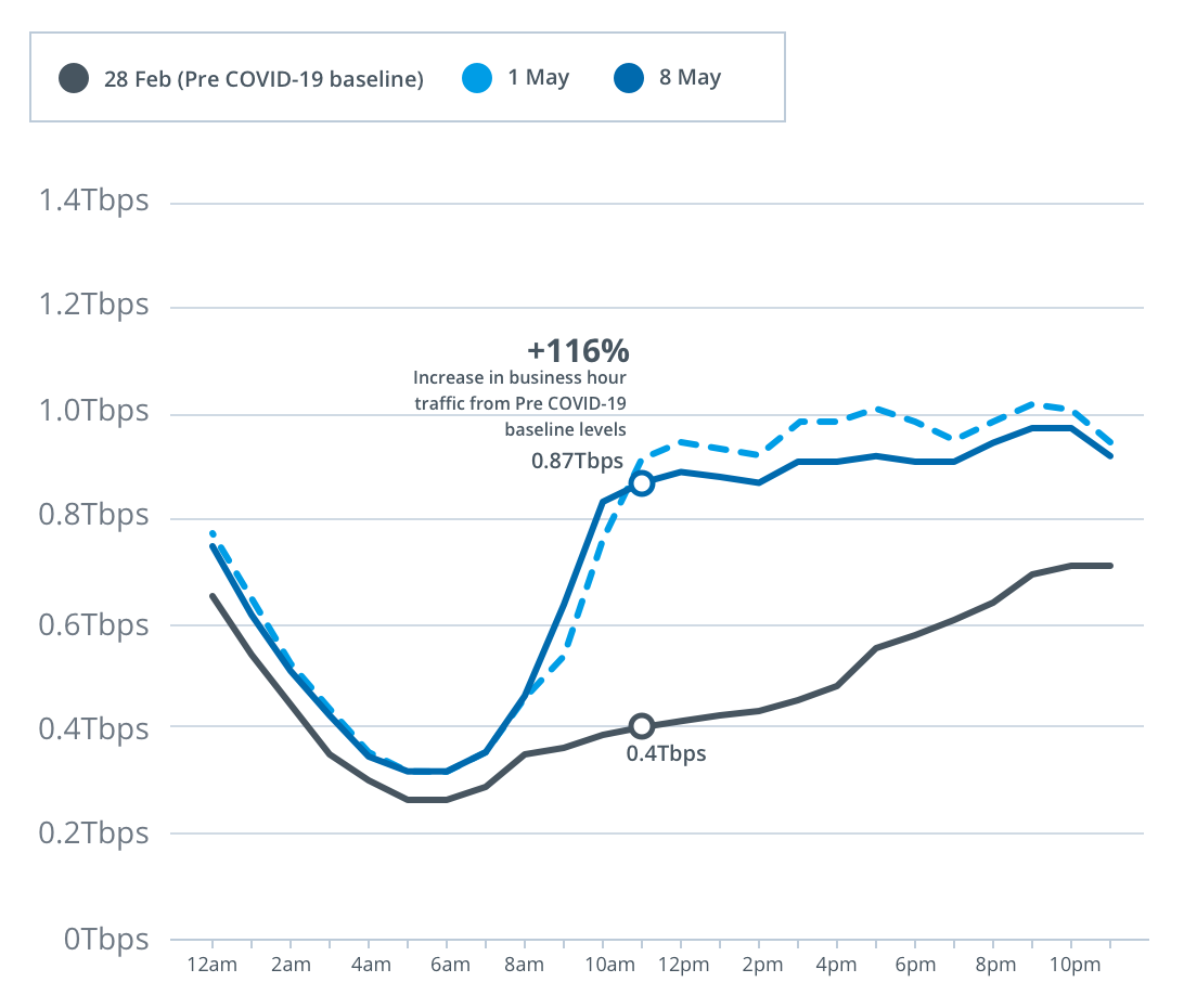 Upstream network usage on the nbn main wholesale service during business hours on 8 May 2020 was 116 per cent higher (as shown in the graph below at 11am) than the pre-COVID-19 baseline.