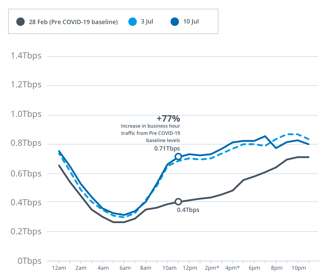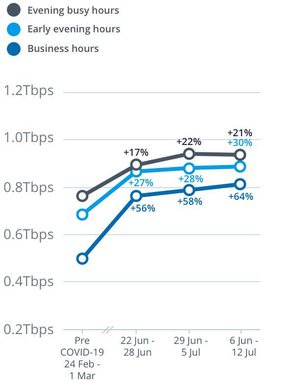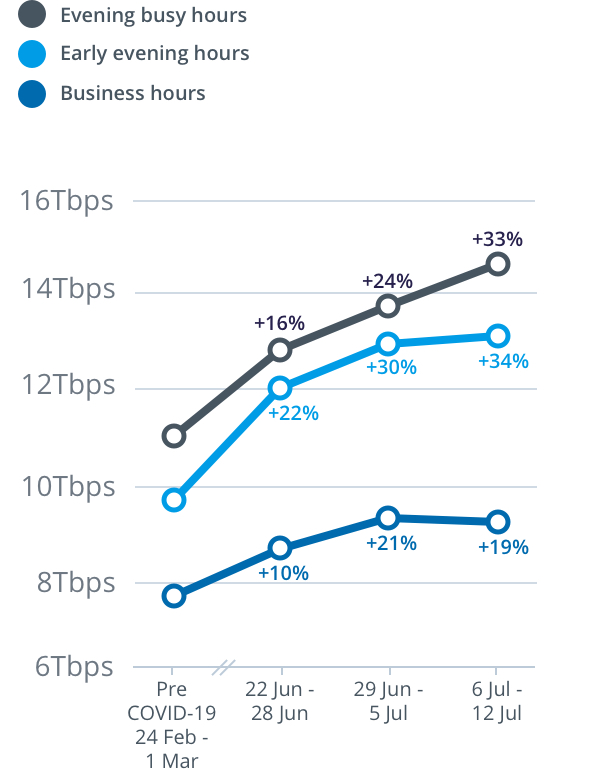 Peak download throughput during the same week also increased during daytime business hours, up 19 per cent to 9.3Tbps, and early evening hours up 34 per cent to 13.2Tbps, compared to the pre-COVID-19 baseline.