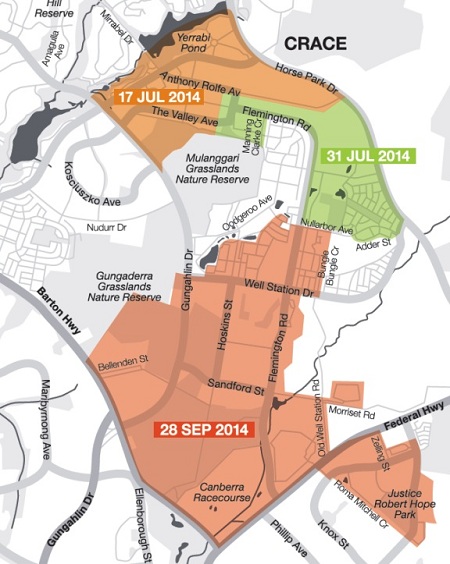 For the first time in the ACT, the NBN is scheduled to replace most existing home and business phones, ADSL internet and Telstra cable internet services in parts of Gungahlin, which will be switched off from 17 July 2014. (Locations outlined in map below.)