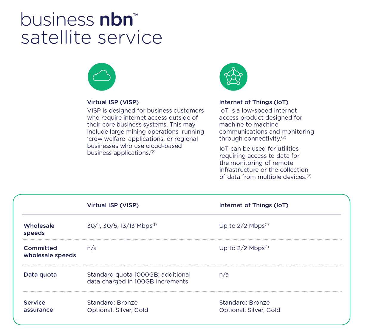 • All business nbn™ Satellite Service offerings provide a number of configurable options, including three service assurance levels managed through business nbn’s Satellite Operations Centre.