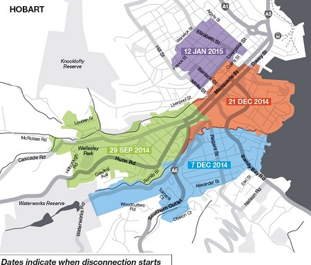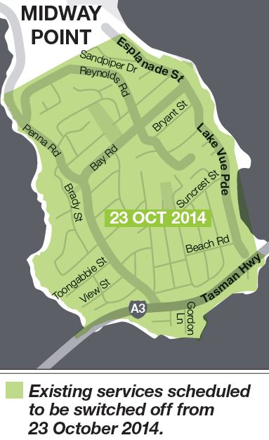 The first of several areas in Tasmania including Deloraine, George Town, Kingston Beach, St Helens, Sorell, and Triabunna are scheduled to be switched off from the existing copper network from 23 May 2014 with further areas planned to follow later in the year.
