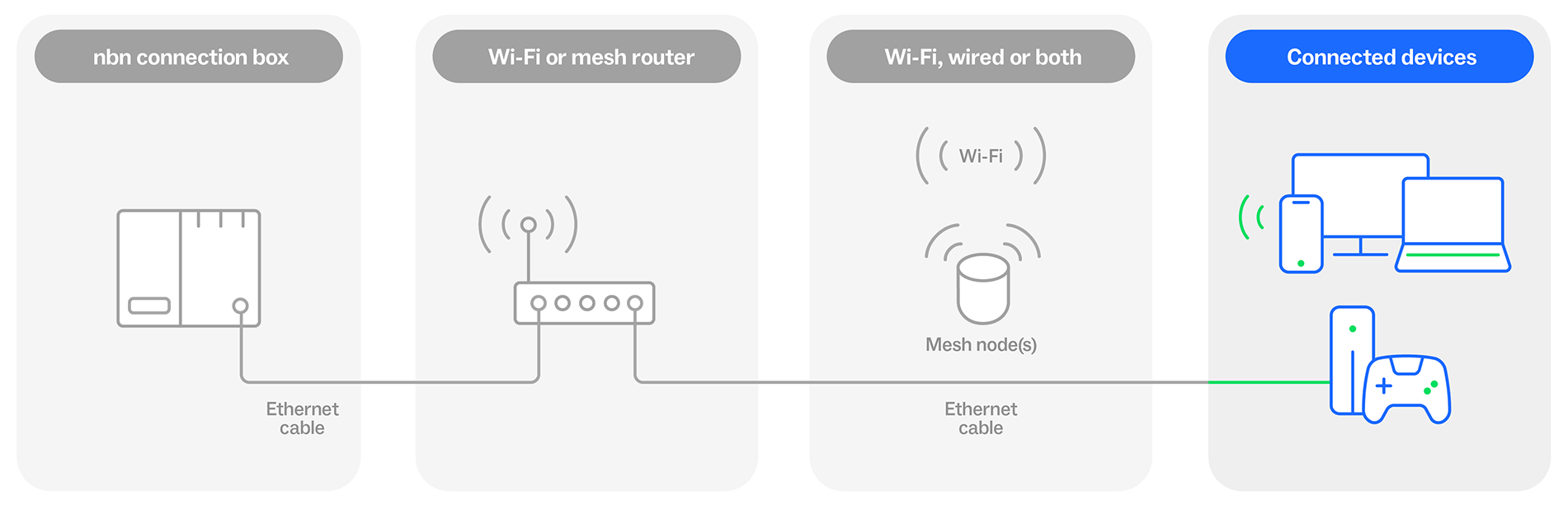 To enjoy a great online experience, all of your internet set-up should be optimised to work together. We recommend checking whether your devices, your router and any connecting cables are compatible, so you can get the most out of your nbn plan.